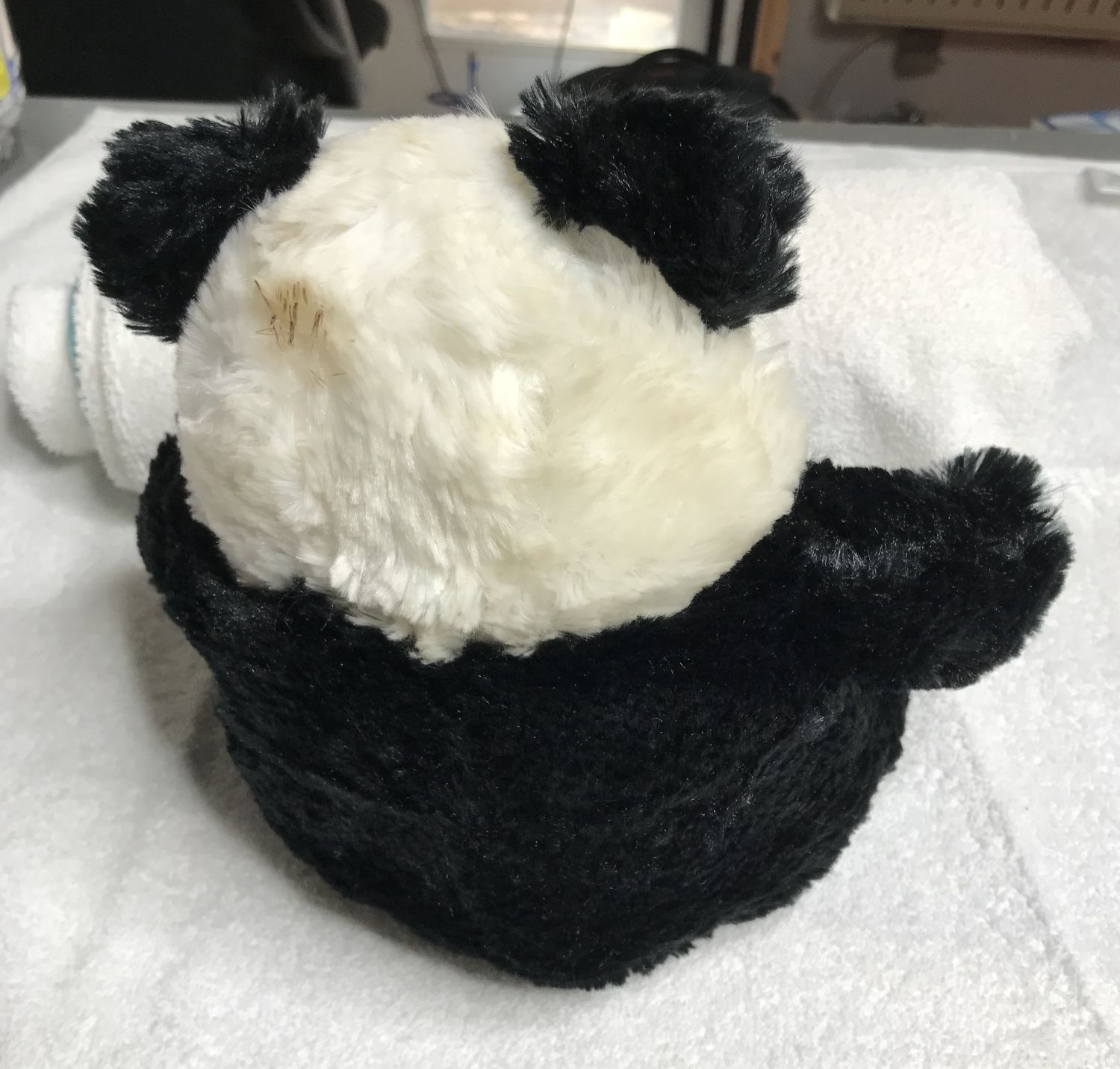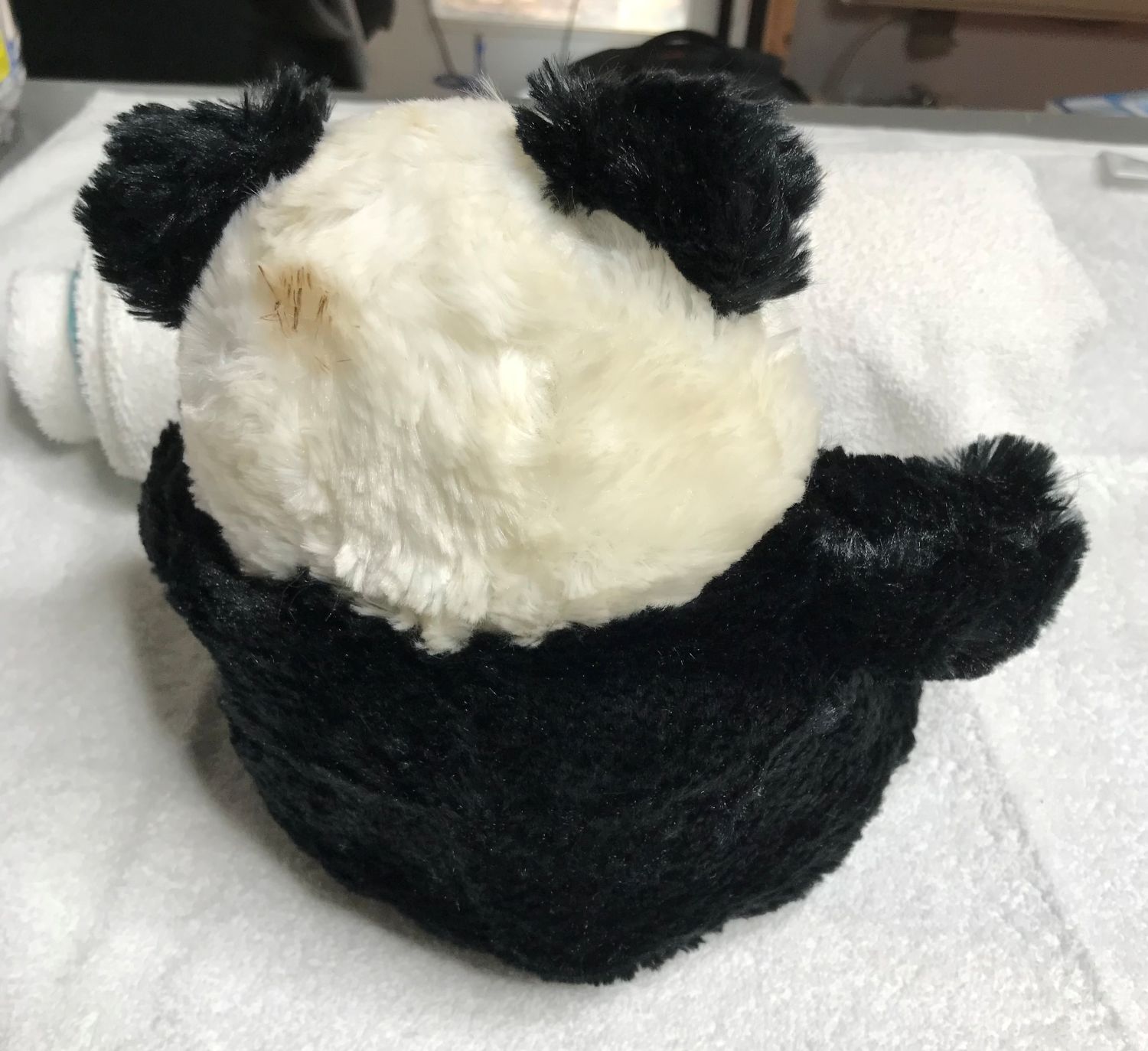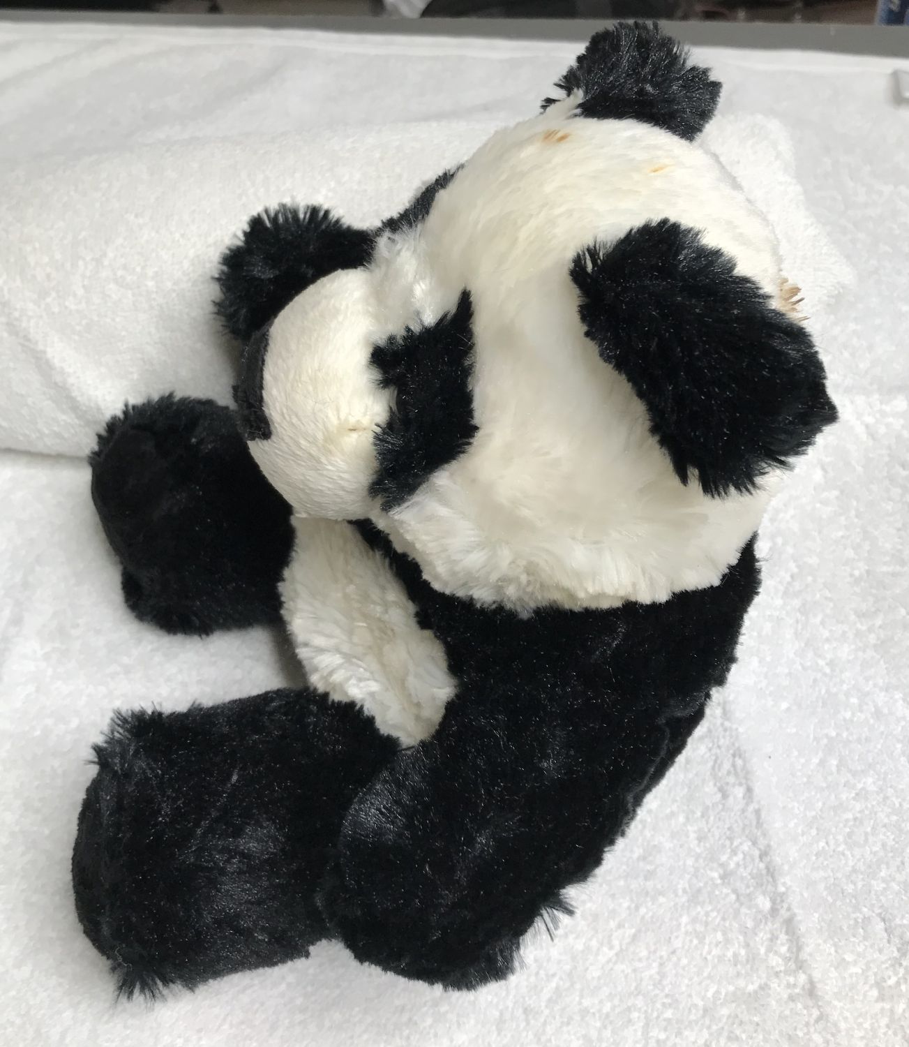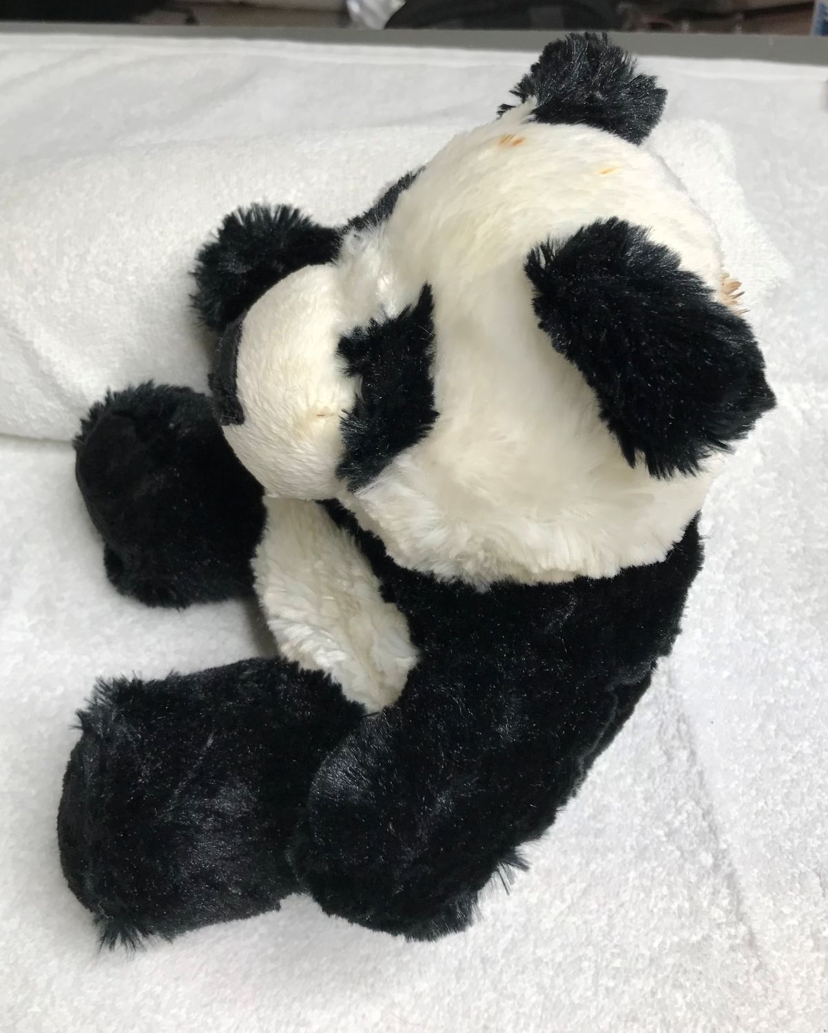 • Color & Features: Black body with a white head and front, black plastic eyes surrounded by black patches, black nose, and black ears.