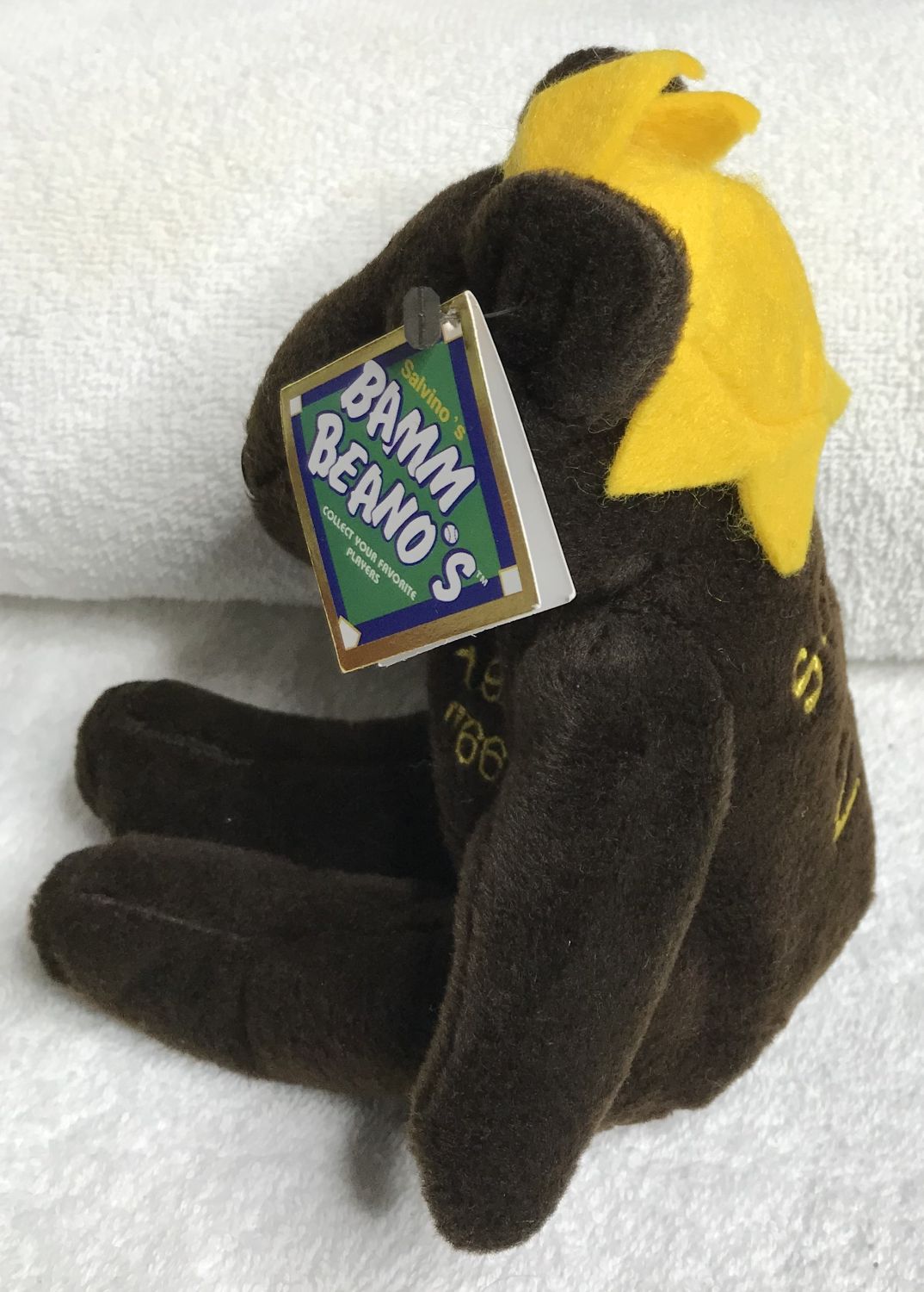 Add a piece of baseball history to your collection with this Salvino’s Bamm Beano’s Sammy Sosa #21 bear! This dark brown plush bear features a yellow hat, black plastic eyes and nose, and embroidered details honoring Sosa’s iconic 1998 season.