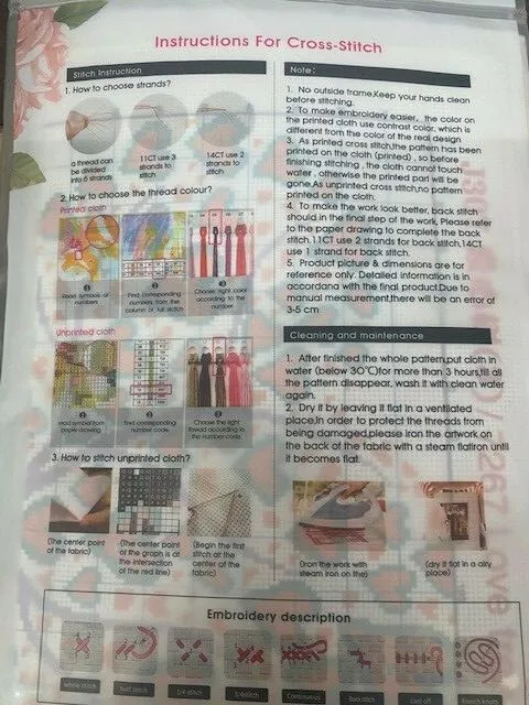 The pattern has been printed on the cloth(14CT printed or 11CT printed), so before finishing stitching, the cloth cannot touch water, otherwise the printed part will disappear.