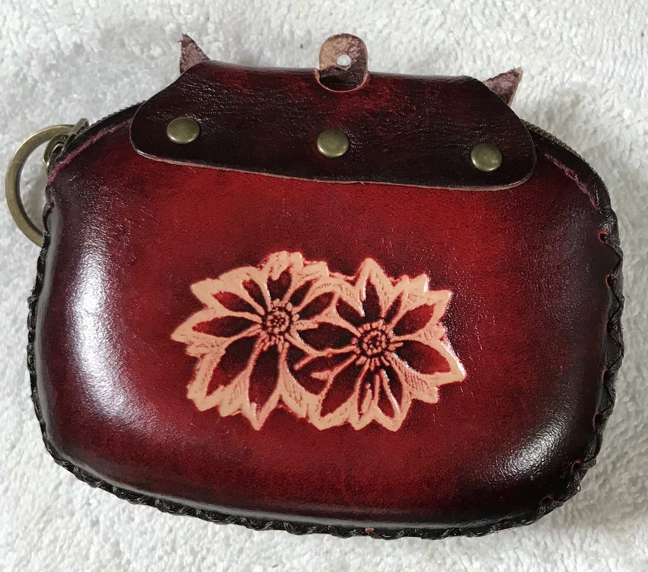 Stylish and compact coin purse made from genuine leather featuring an embossed cat design on the front and a floral pattern on the back. This small wristlet pouch is perfect for holding coins, keys, cash, or small essentials while on the go.