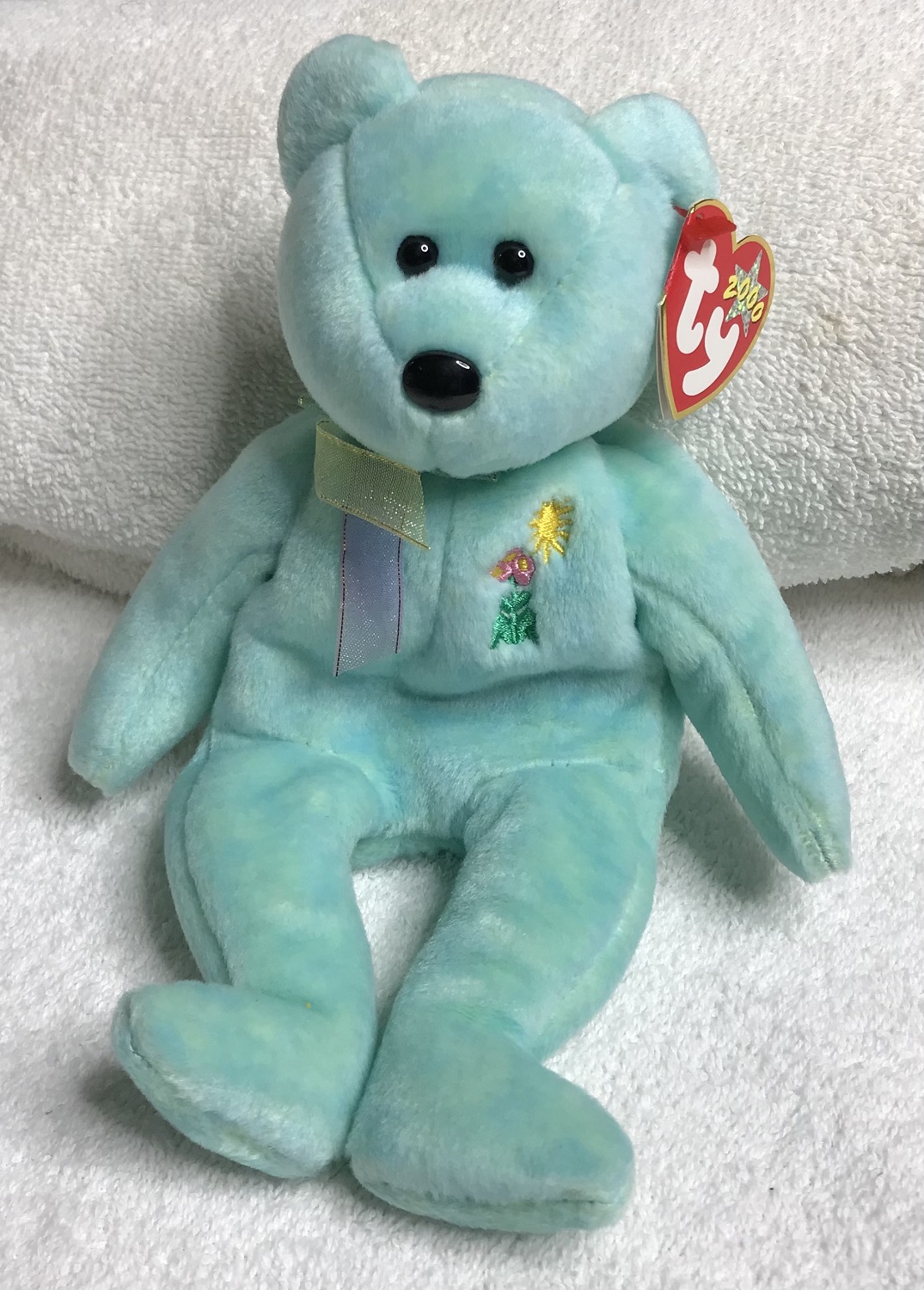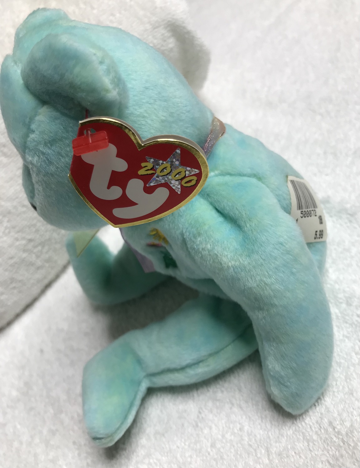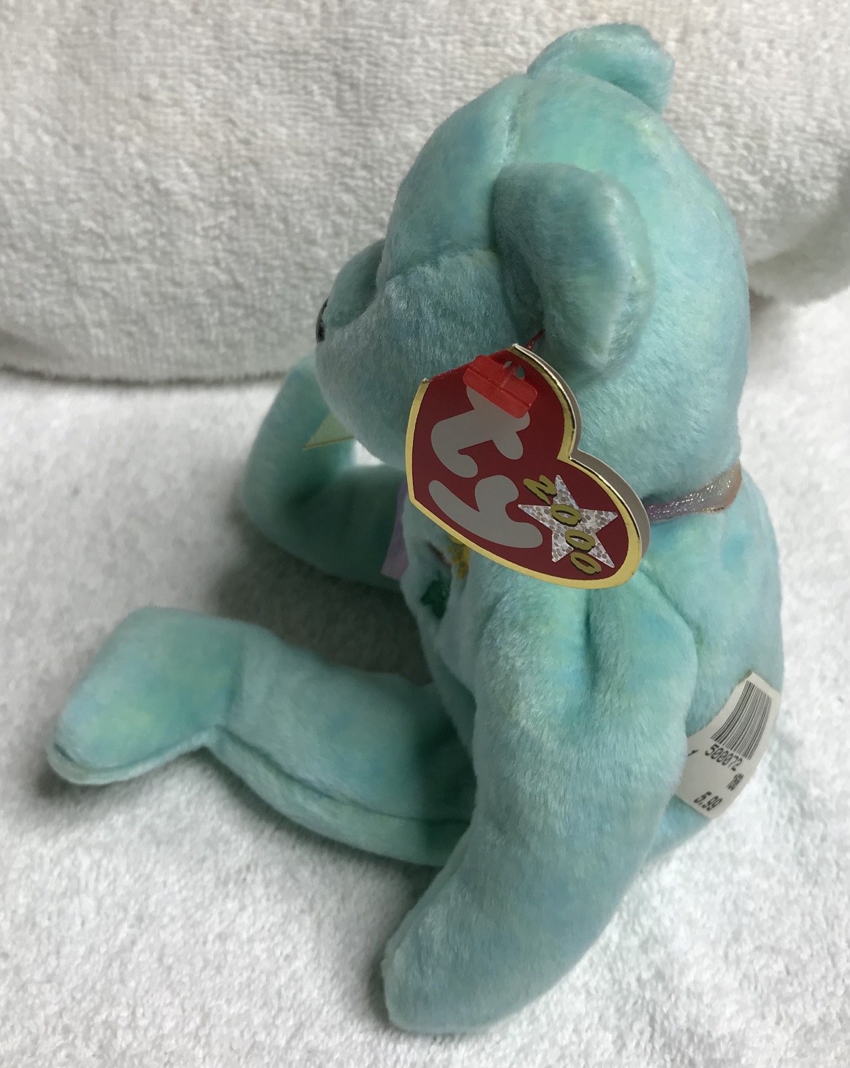 This bear includes both original tags, a silver star with ‘2000’ on the hang tag front, and a silver square on the tush tag — making it a meaningful, collectible piece of Beanie Baby history.