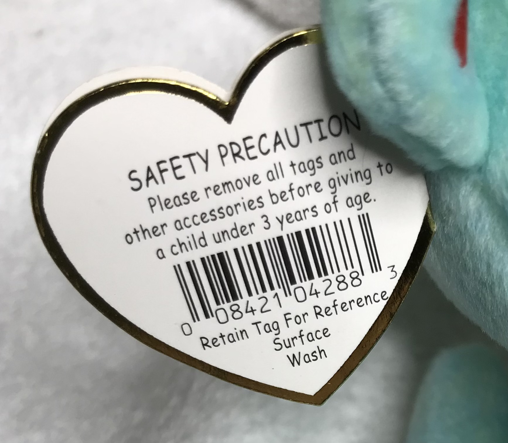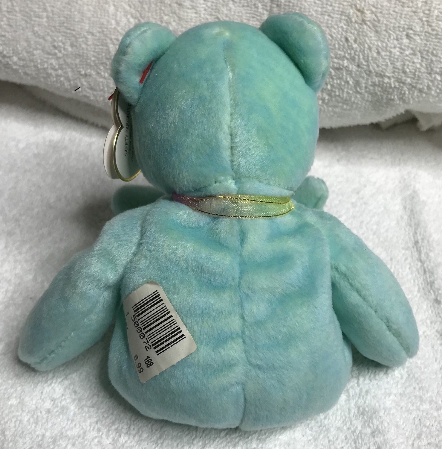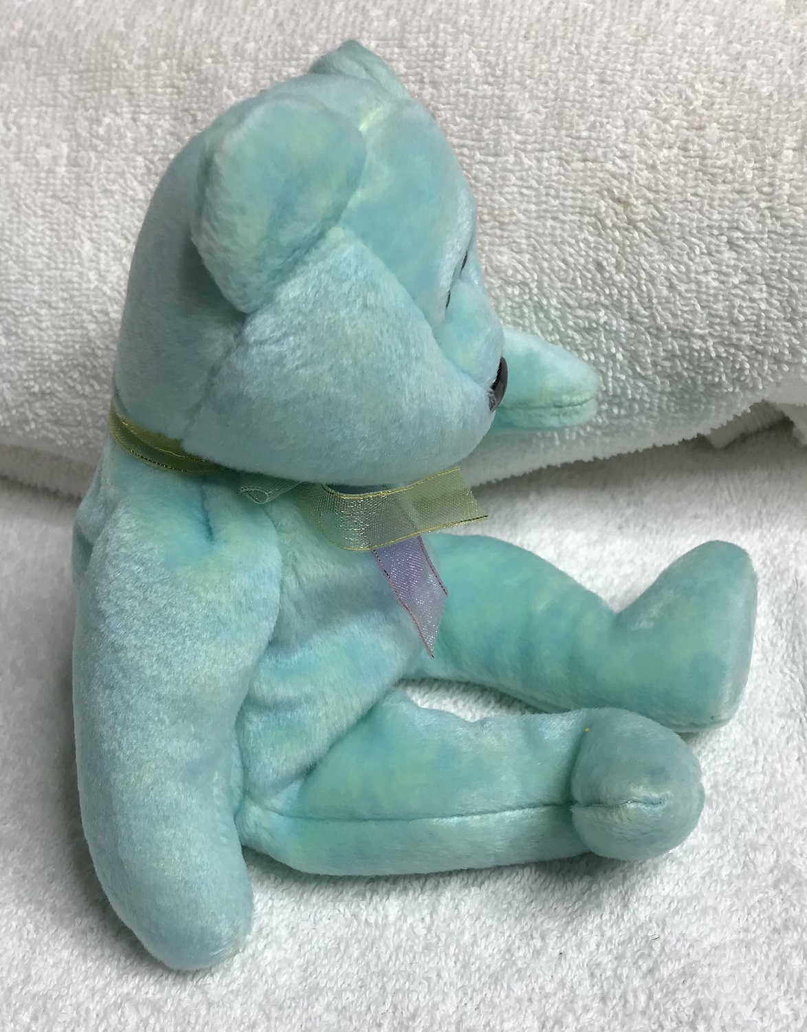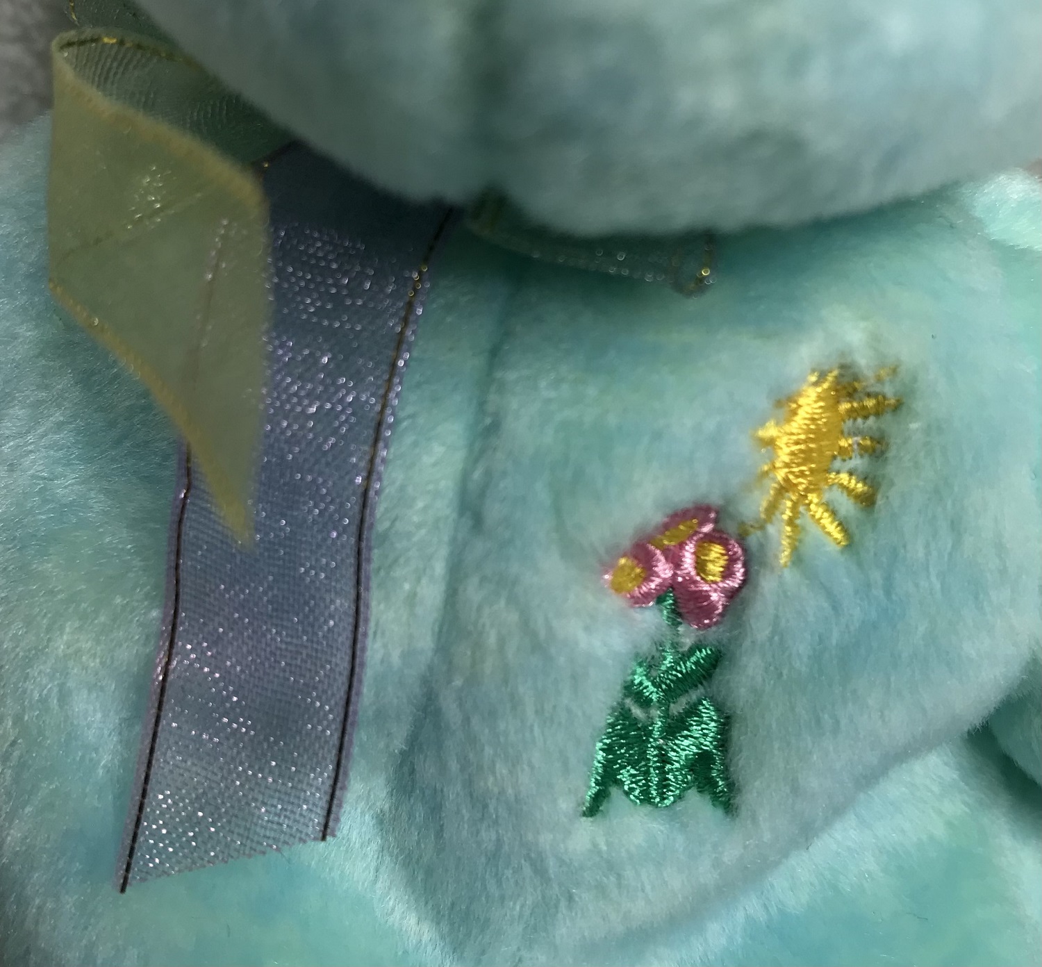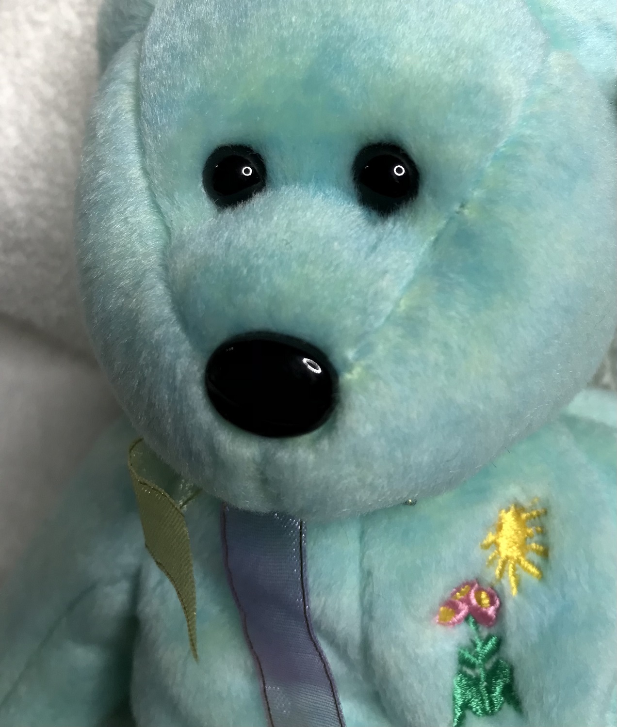 Ariel the Bear is a heartfelt commemorative Ty Beanie Baby released in 2000 in memory of Ariel Glaser, a young girl who passed away from complications of AIDS in 1988. This bear features a soothing seafoam green color, with a chest embroidered with pink roses, green leaves, and a shining sun—a design inspired by Ariel’s own artwork.