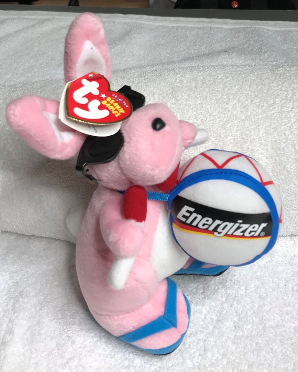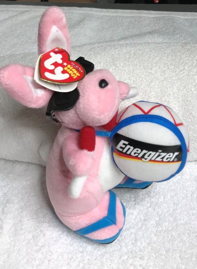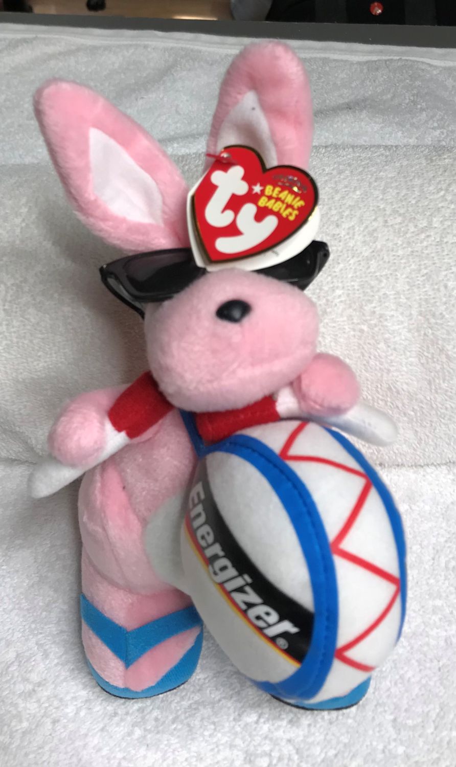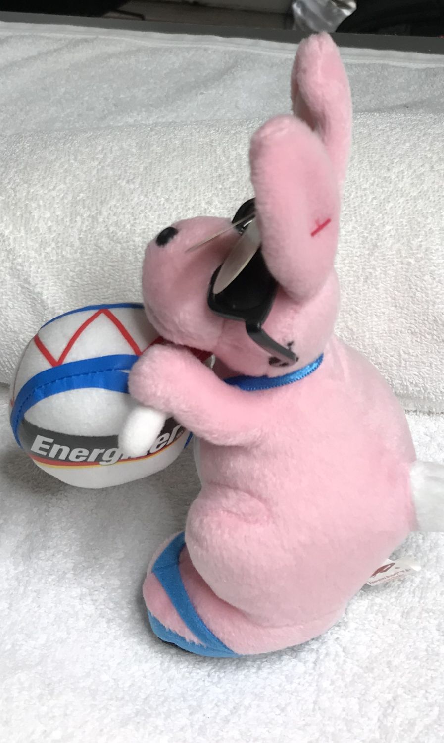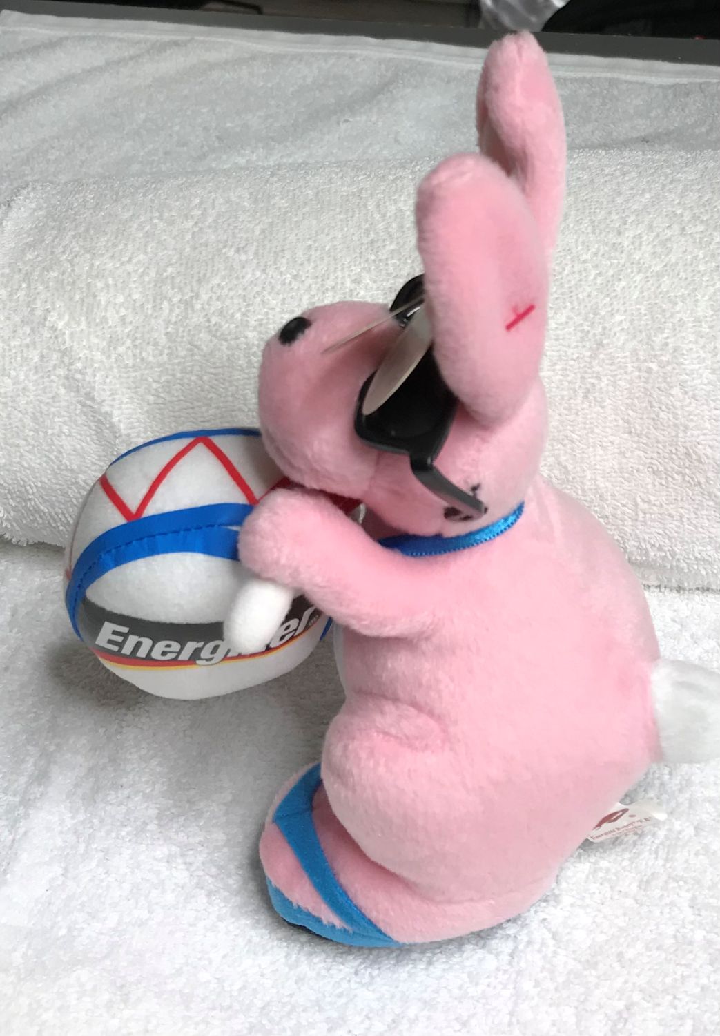 Color & Features: Pink plush with white tail, inner ears, and chest; orange beak and feet; black plastic eyes; black plastic nose; wearing black sunglasses and blue flip-flop shoes with black soles; holding a white drum with blue and red trim labeled “Energizer” on each side; drumsticks are white and red.