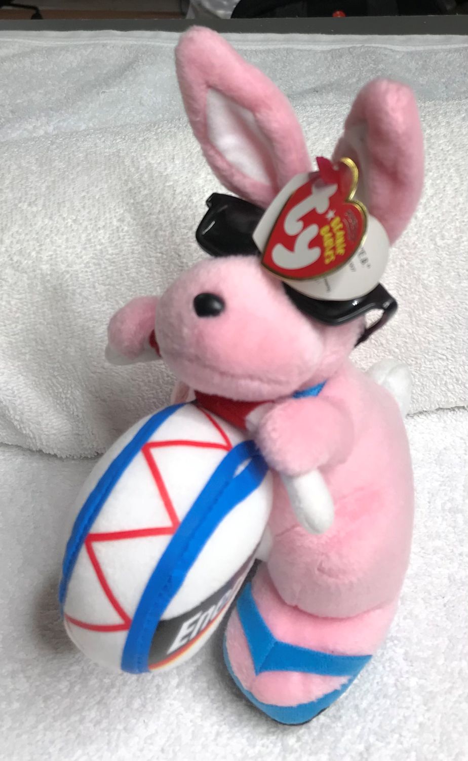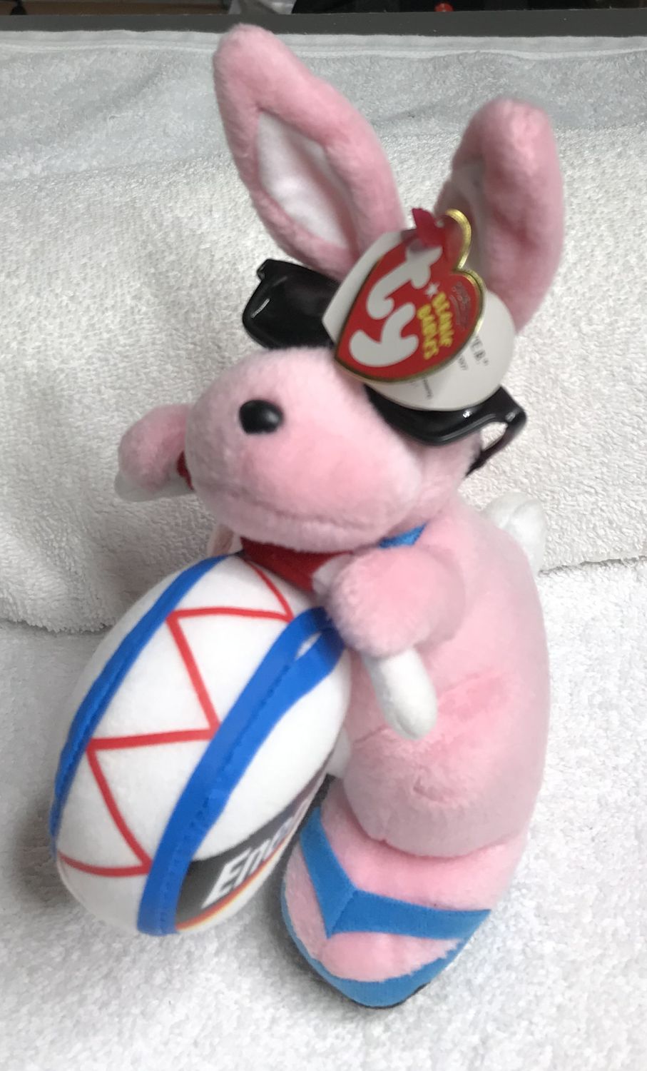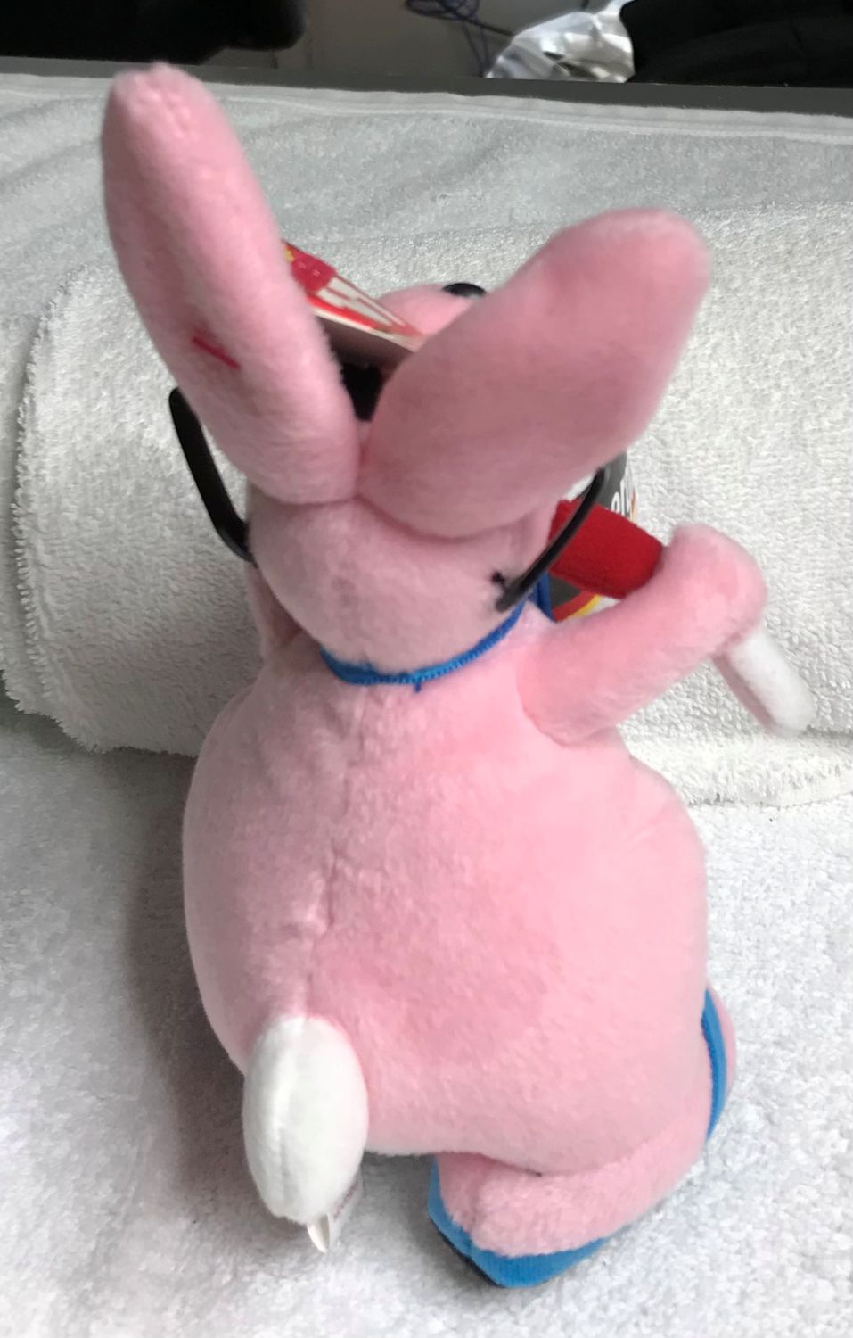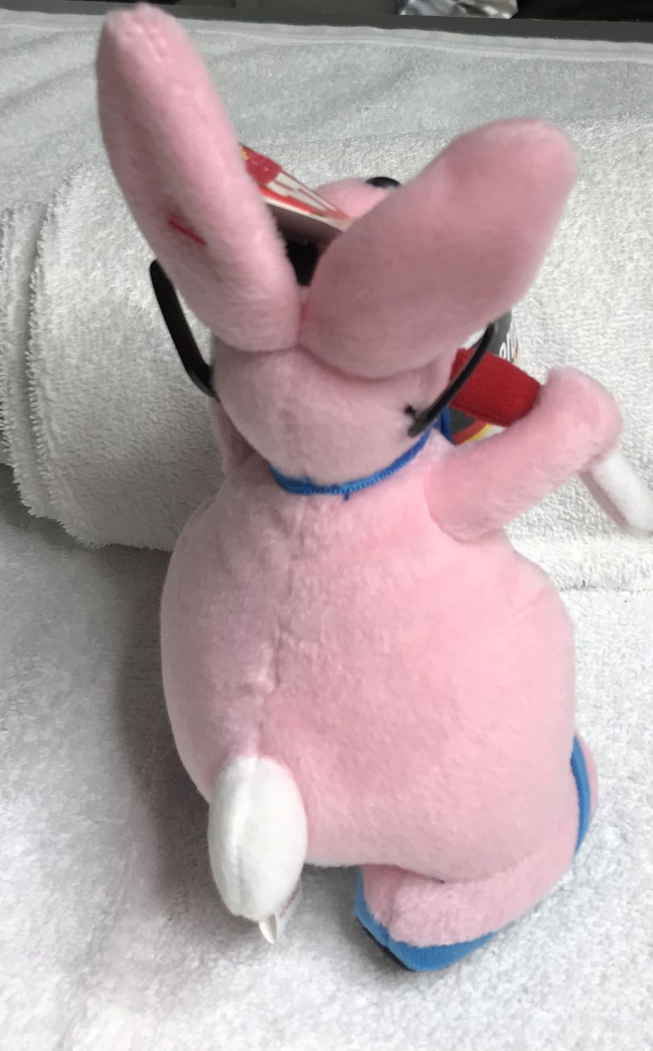 Color & Features: Pink plush with white tail, inner ears, and chest; orange beak and feet; black plastic eyes; black plastic nose; wearing black sunglasses and blue flip-flop shoes with black soles; holding a white drum with blue and red trim labeled “Energizer” on each side; drumsticks are white and red.