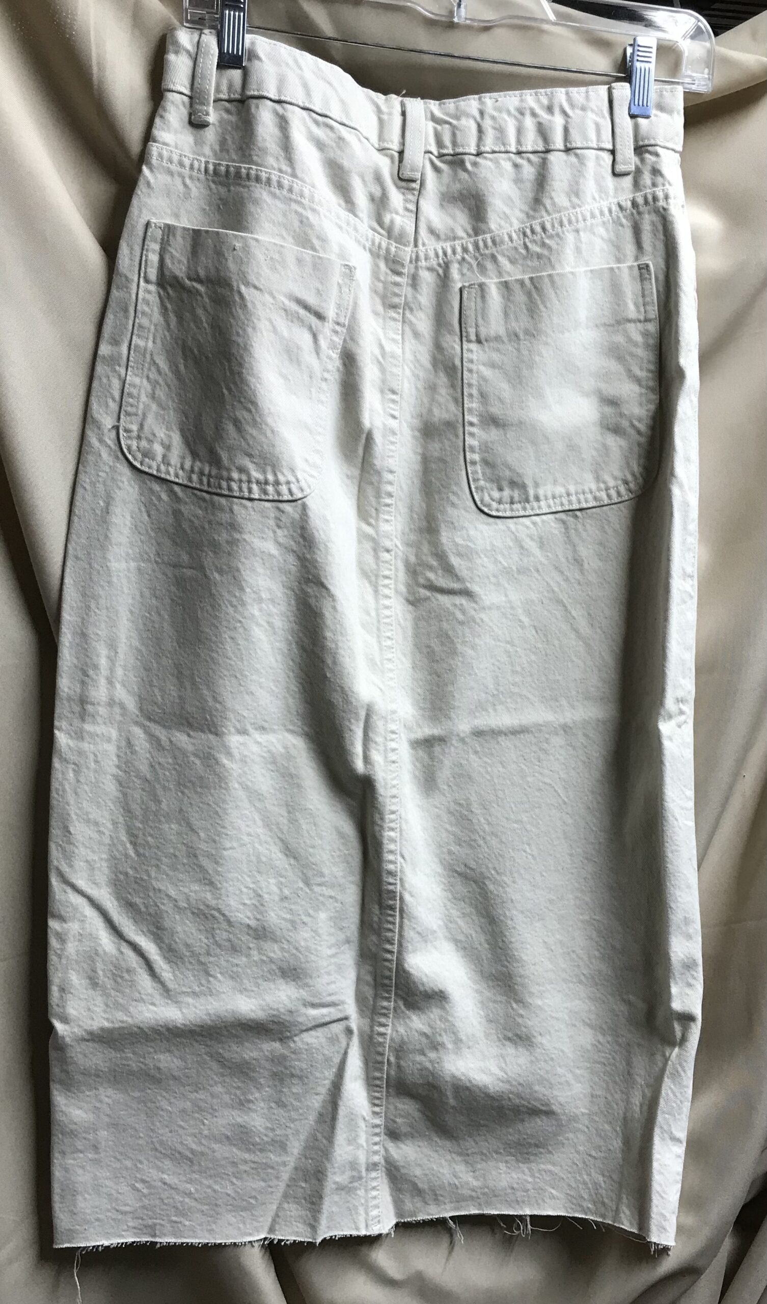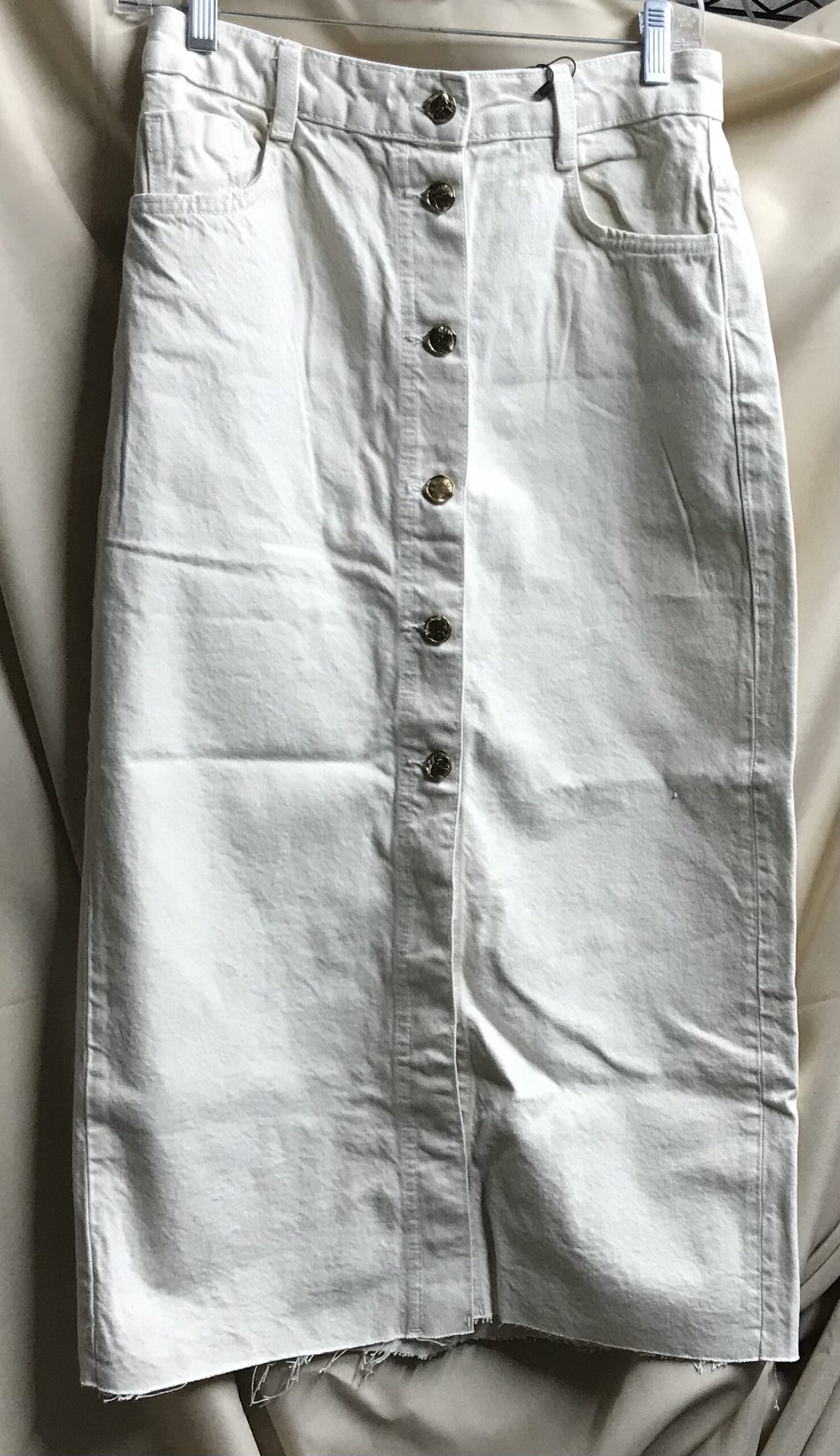 Brand new Zara denim maxi skirt in a chic eggshell/off-white tone. Features a raw frayed hem and stylish front button closure for a trendy cutoff look. Made from quality materials and designed for a flattering fit.